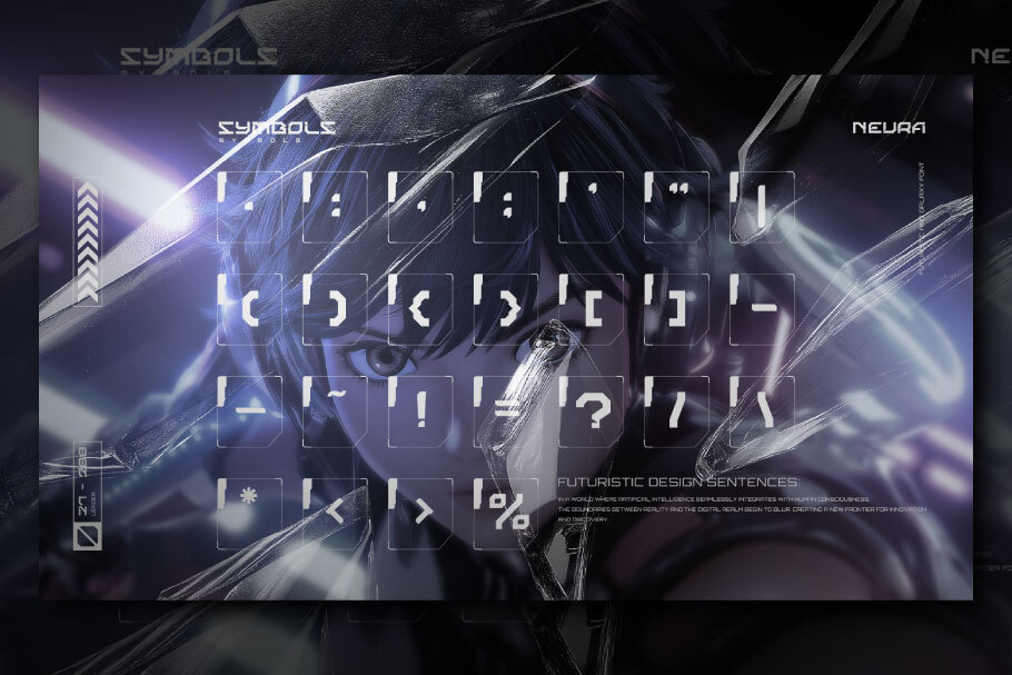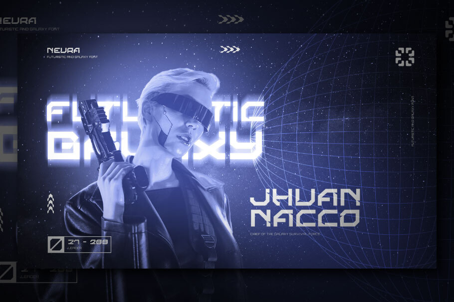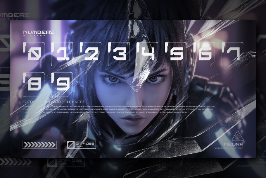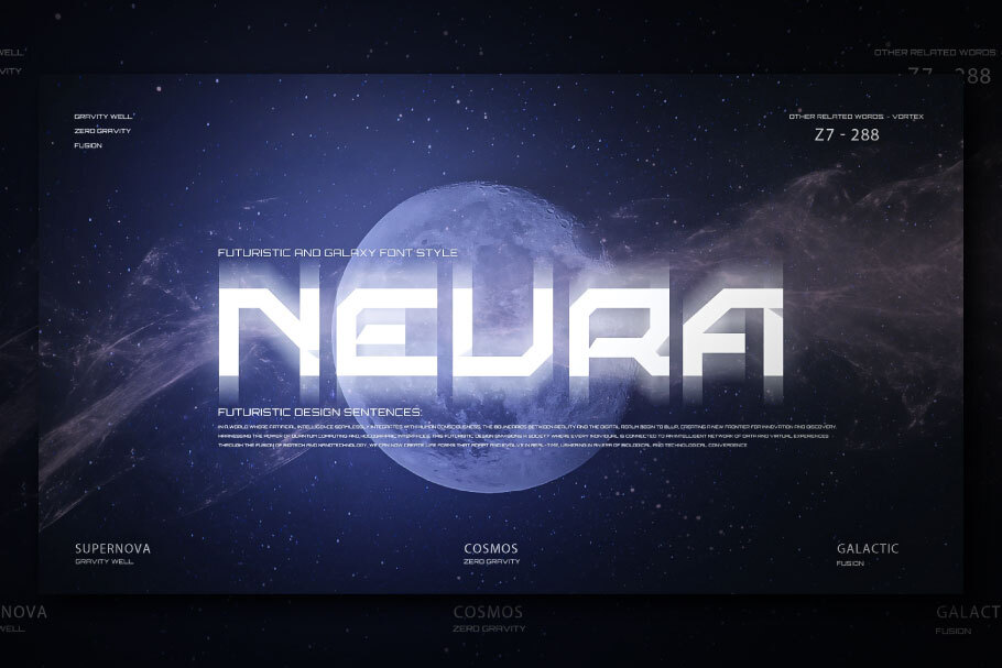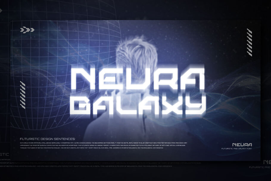 NEURA This font combines futuristic and galaxy-inspired elements, creating a visual impression that links advanced technology with the limitless beauty of the universe. Its letterforms are inspired by sharp, elegant geometric shapes, conveying a modern vibe, while thin lines and glowing effects suggest the depth of outer space. Ideal for design projects focused on innovation, space exploration, or concepts that emphasize technological progress. This font is the perfect choice to evoke a futuristic atmosphere full of mystery and adventure